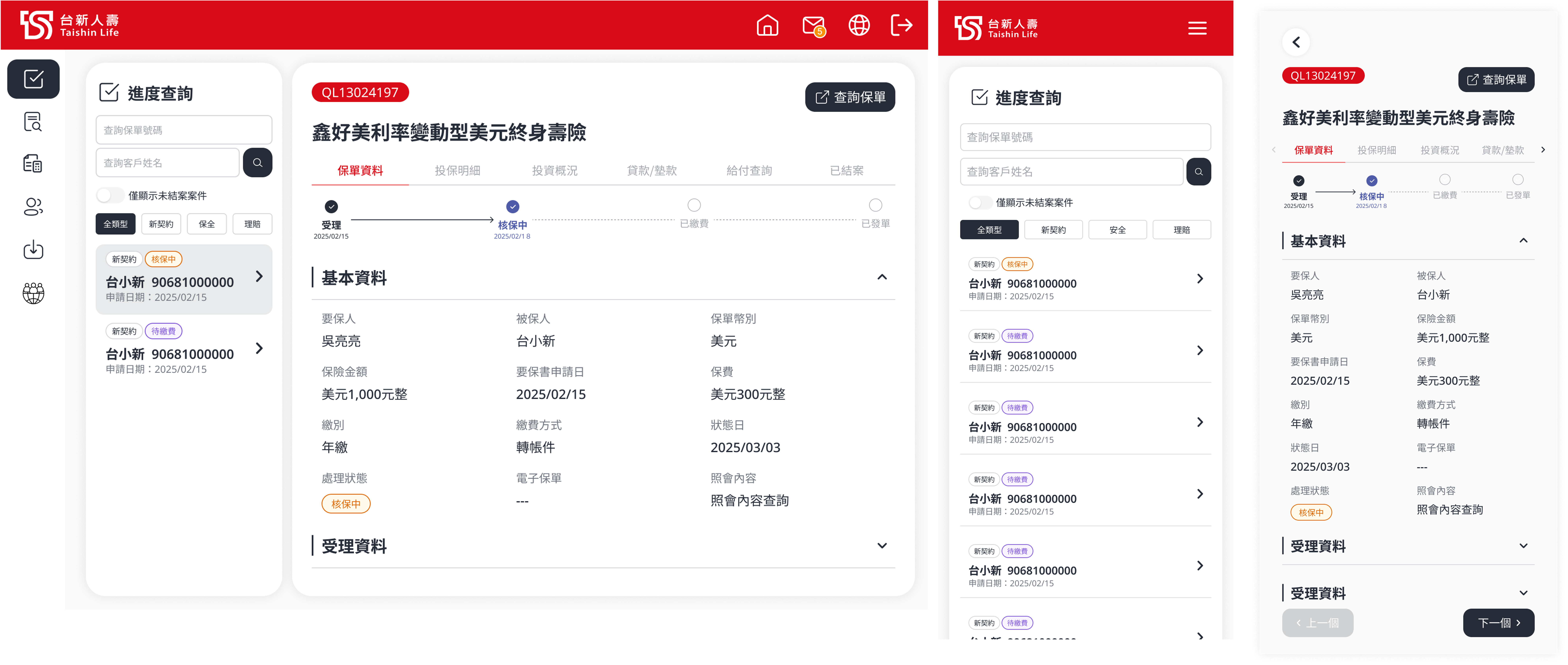 從要保書進件、核保到最終發單,所有案件的處理進度一目了然。系統會主動推播最新狀態,讓業務員能即時回覆客戶疑問,有效管理客戶期待,提升整體服務滿意度。